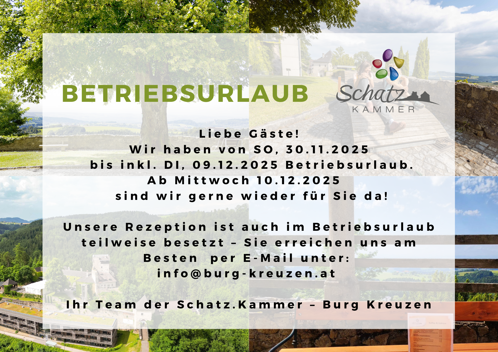 Die Seele baumeln und den Alltag hinter sich lassen – einfach Ruhe finden. Verbringen Sie bei uns einen unvergesslichen Aufenthalt inmitten der Natur. Ganz egal ob Familienurlaub, Wander- oder Radurlaub, Schul- oder Jugendausflug – unser Hotel bietet für jeden etwas. Genießen Sie unser modernes Ambiente mit Burgflair. Nutzen Sie die Schatzkammer als Ausgangspunkt für Radtouren am Donauradweg, Wanderungen am Donausteig oder den Besuch von Kulturveranstaltungen im Strudengau. Für Hochzeiten, Familien- oder Firmenfeiern bietet die Burg den stimmungsvollen Rahmen. Unser professionelles Team unterstützt Sie tatkräftig bei der Planung Ihres Events.