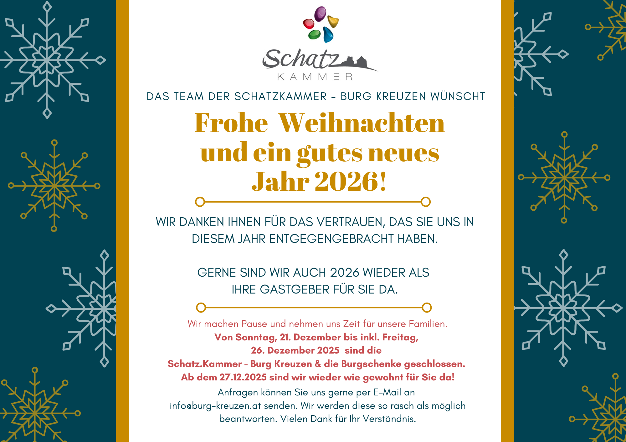Für Feste aller Art bietet die Burg Kreuzen ein besonderes Ambiente. Ob Geburtstags- oder Weihnachtsfeiern, Familienfeste oder Hochzeiten – die historische Burg Kreuzen bildet eine traumhafte Kulisse für Ihr unvergessliches Event.
